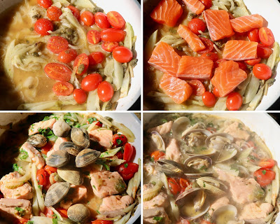 Die Scheiben vom Lachs in die Pfanne geben. Nur ein bis zwei Minuten garen. Dann den Wein hinein schütten. Vielleicht noch eine weitere Kelle Fond dazu geben. Salzen und Pfeffern, vorsichtig mit den Salz sein, denn die Anchovies sind schon sehr salzig. Petersilie und Fenchelgrün dazu geben.