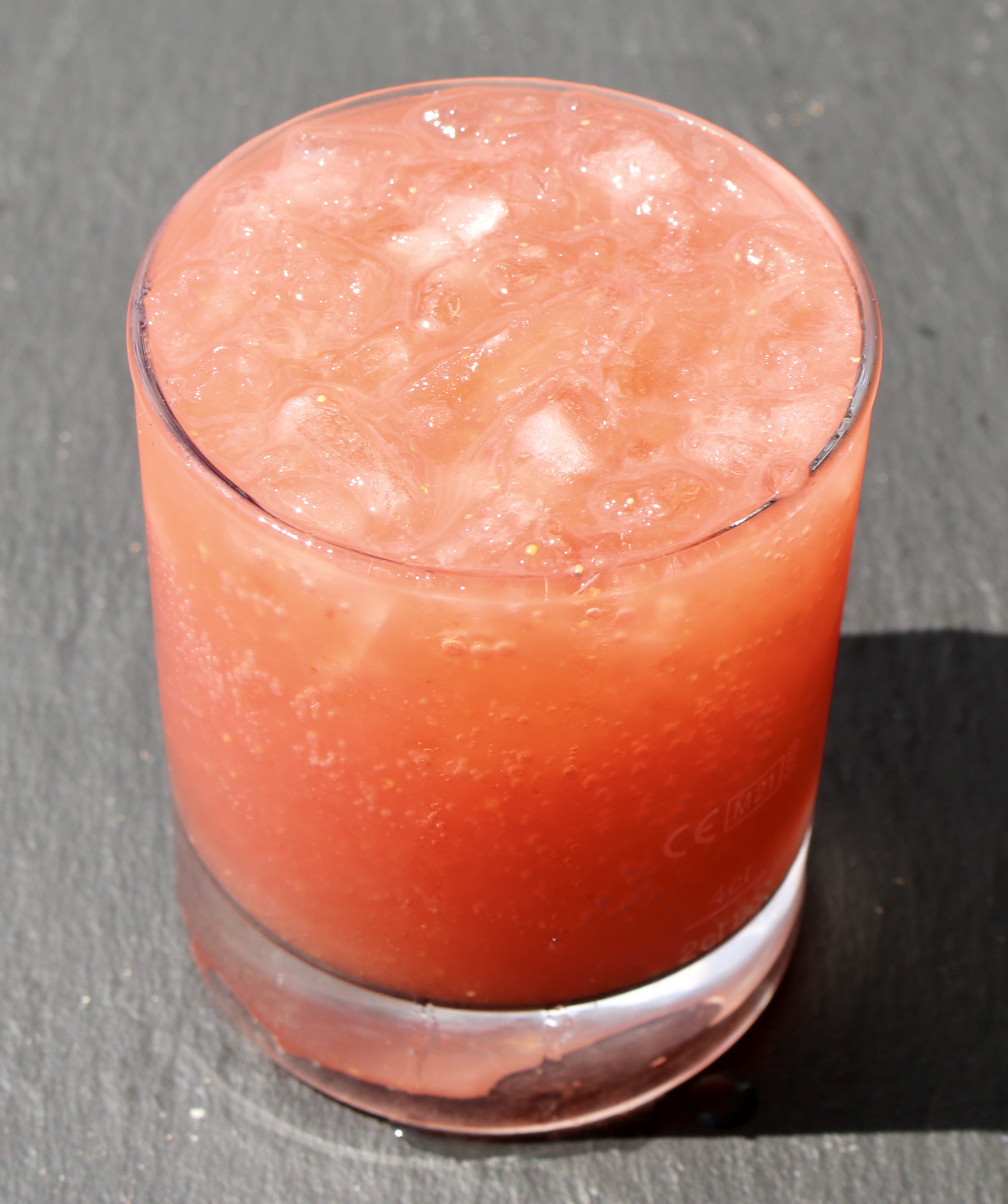 Alle Zutaten zusammen mit Crushed Ice in den Mixer geben und mixen bis sich das Eis fast vollständig aufgelöst hat, anschließend in einen Tumbler füllen. Danach weiteres Crushed Ice in den Tumbler geben bis das Glas gefüllt ist.
