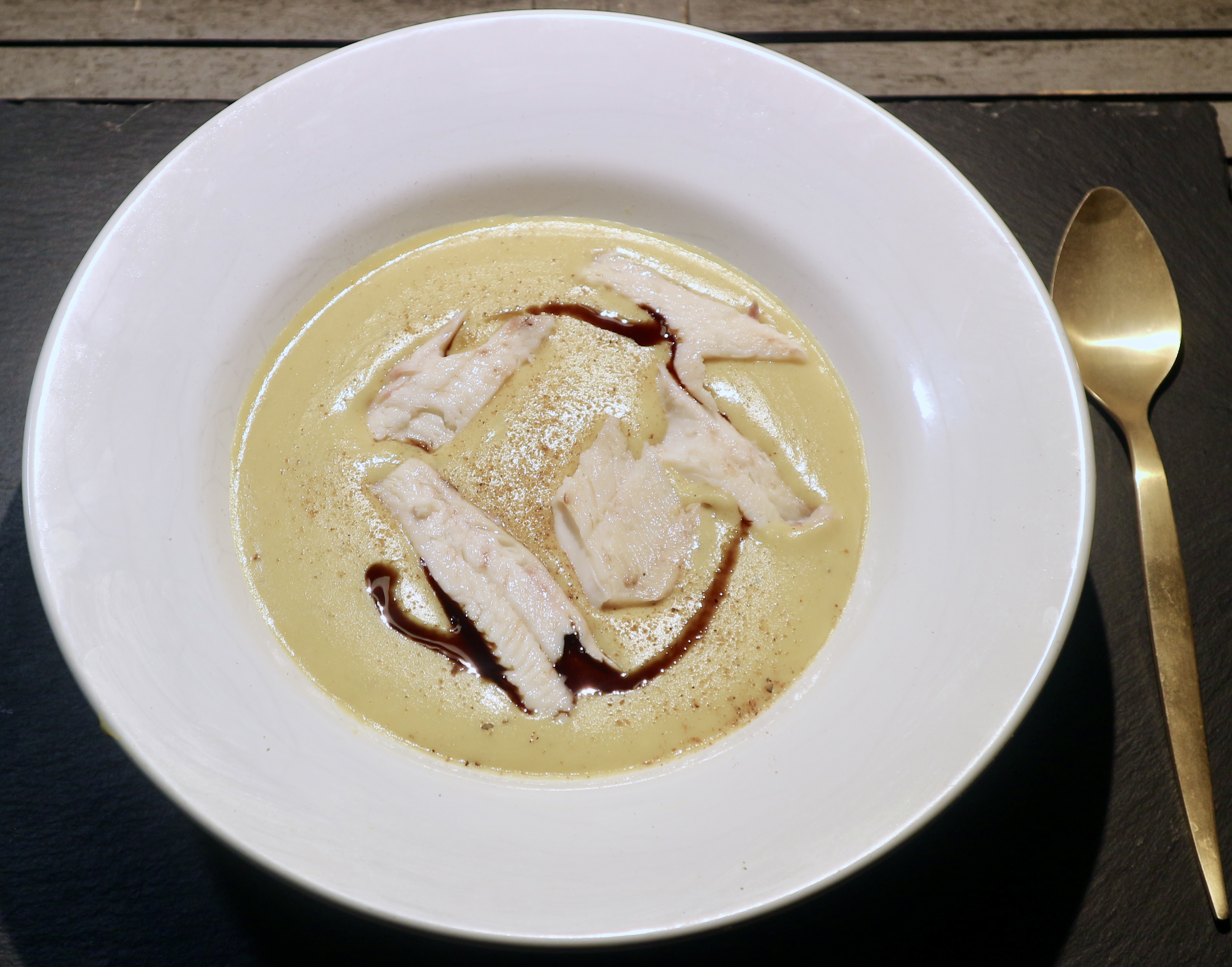 Es wird von der Basis eine ganz klassische Kartoffelsuppe. Aufgepeppt wird die Suppe mit Wasabi, Kürbiskernöl, Muskatnuss und als Einlage nehme ich geräucherte Forelle aus der Region. Bis auf das Wasabi sind die Zutaten heimisch und das Wasabi könnte auch durch Meerrettich ersetzt werden. Diese leicht scharfe, cremige Suppe schmeckt hervorragend mit dem geräuchertem Fisch. In kleineren Portionen eignet sich die Suppe bestimmt auch als Vorspeise.